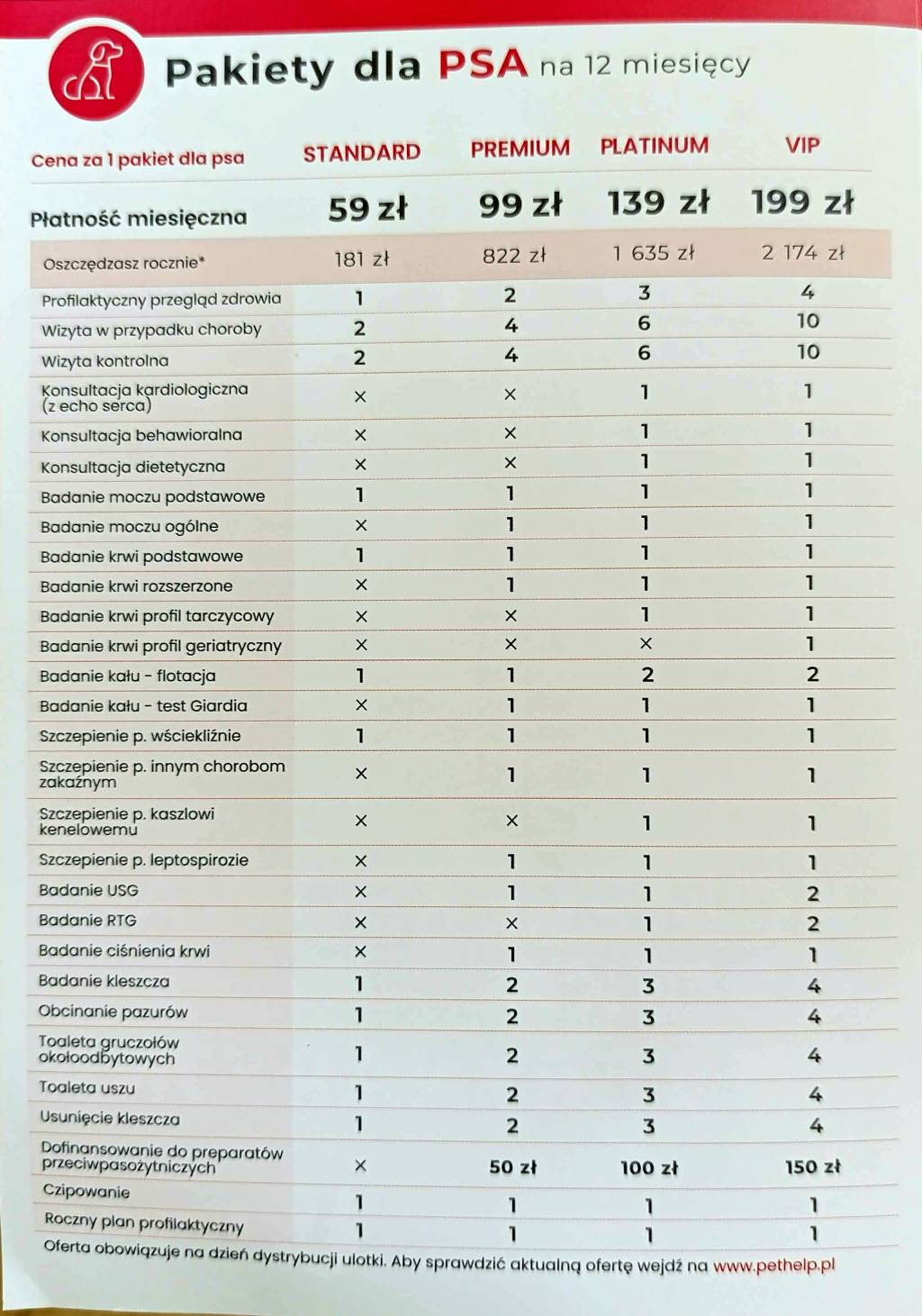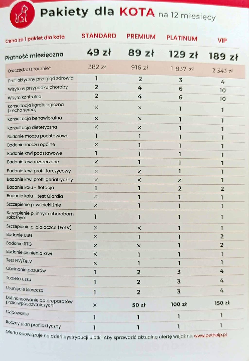 Twoje zwierzę zasługuje na najlepszą opiekę, a Ty zasługujesz na spokój ducha. Pakiet weterynaryjny PetHelp to rozwiązanie, które zadba o zdrowie Twojego psa czy kota i pozwoli Ci uniknąć nieprzewidzianych kosztów leczenia. Dzięki szerokiej gamie pakietów i wyjątkowym korzyściom, masz pewność, że Twój zwierzak otrzyma najwyższej jakości opiekę bez obciążania Twojego budżetu. PetHelp oferuje kilka opcji pakietów, które odpowiadają różnym potrzebom zdrowotnym i wiekowym Twojego zwierzaka (psa lub kota) - Standard, Premium, Platinum, VIP. Każdy z nich różni się liczbą dostepnych usług. Tabelke porównawczą znajdziesz poniżej. Usługi zrealizujesz w wielu weterynaryjny w calej Polsce
